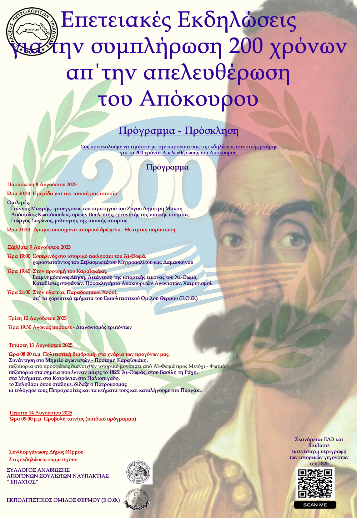 Στις 8 Αυγούστου 2025, ημέρα Παρασκευή και ώρα 20:30 θα πραγματοποιηθεί μικρή Ημερίδα με τρείς ομιλητές και θεατρική παράσταση με δραματοποιημένα ιστορικά στοιχεία της περιόδου εκείνης.
