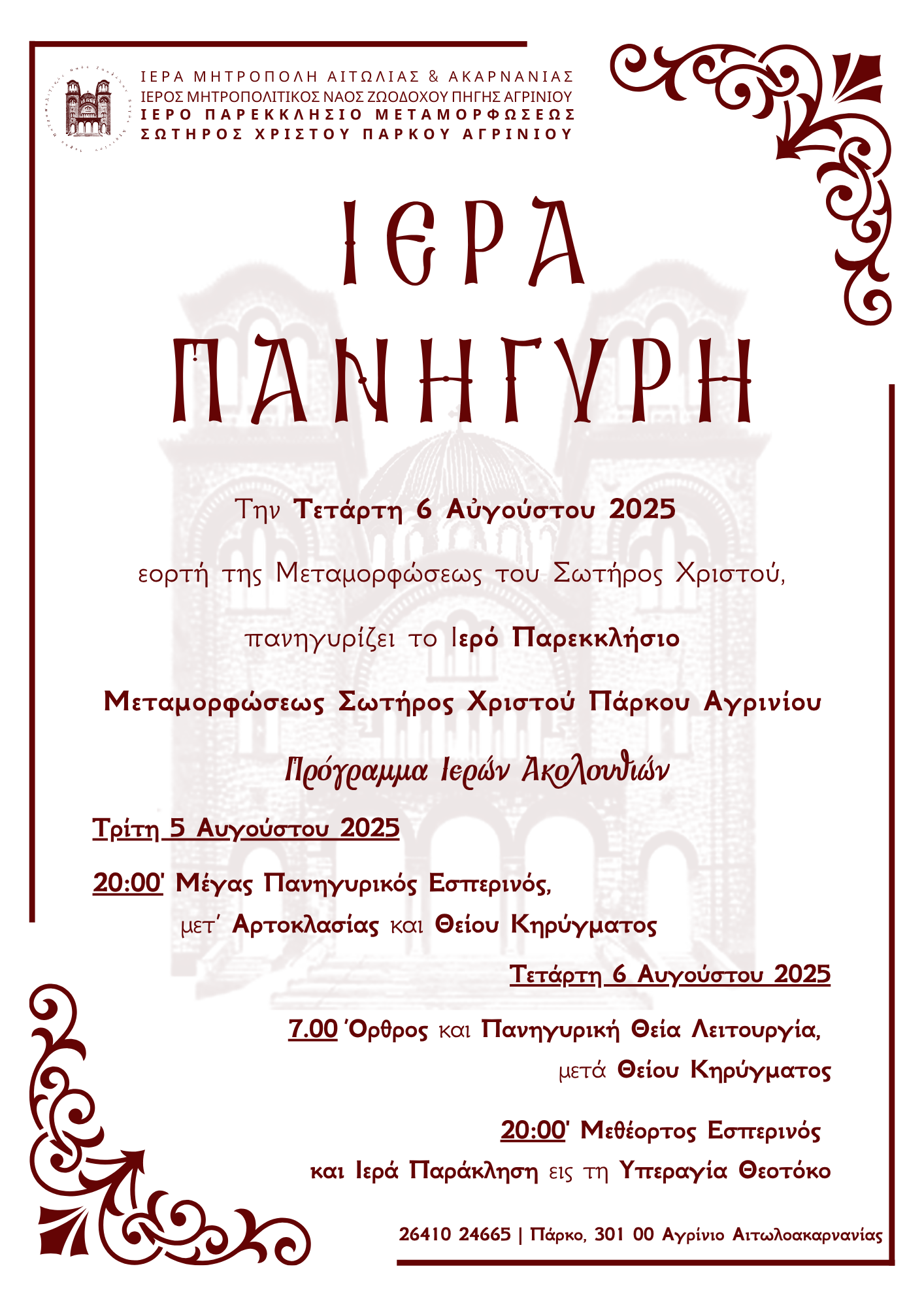 Την Τετάρτη 6 Αυγούστου 2025 εορτή της Θείας Μεταμορφώσεως του Σωτήρος Χριστού, πανηγυρίζει το Ιερό Παρεκκλήσιο Μεταμορφώσεως του Σωτήρος, που βρίσκεται εντός του Πάρκου Αγρινίου, κατά το ακόλουθο πρόγραμμα:
