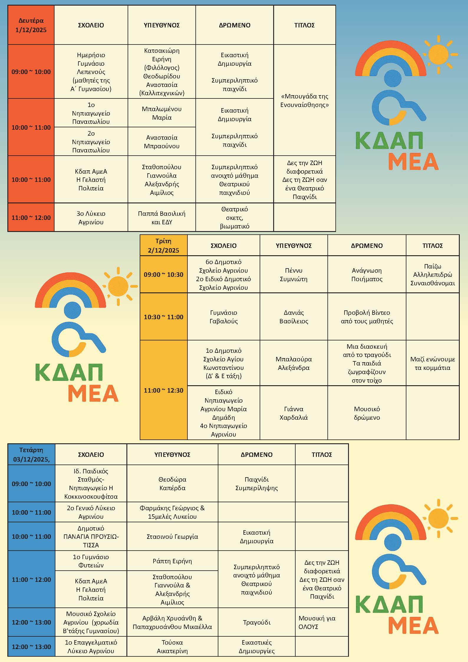 Οι εκδηλώσεις θα πραγματοποιηθούν στην Αίθουσα “Φαντασία” (Μπότσαρη 4, κινηματογράφος Ελληνίς) και περιλαμβάνουν ένα πλούσιο πρόγραμμα δράσεων, που στοχεύουν στην ενημέρωση, την ενδυνάμωση και την καλλιέργεια συμπεριληπτικής κουλτούρας στην καθημερινή ζωή.