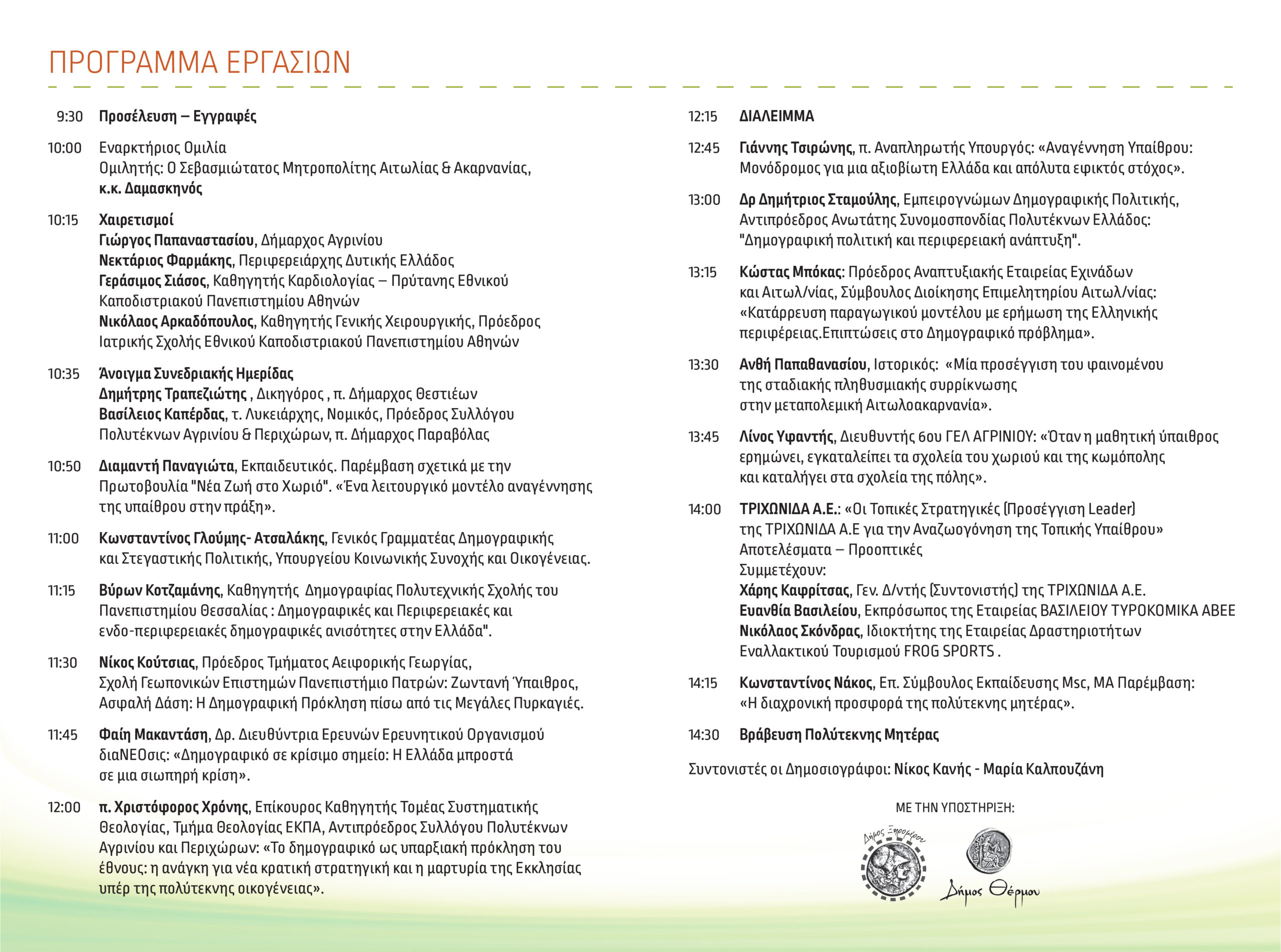 Η ημερίδα συγκεντρώνει διακεκριμένους επιστήμονες, θεσμικούς εκπροσώπους και στελέχη της αυτοδιοίκησης, οι οποίοι θα αναπτύξουν πτυχές του δημογραφικού ζητήματος, της περιφερειακής ανισότητας και των πολιτικών στήριξης της οικογένειας και της υπαίθρου.