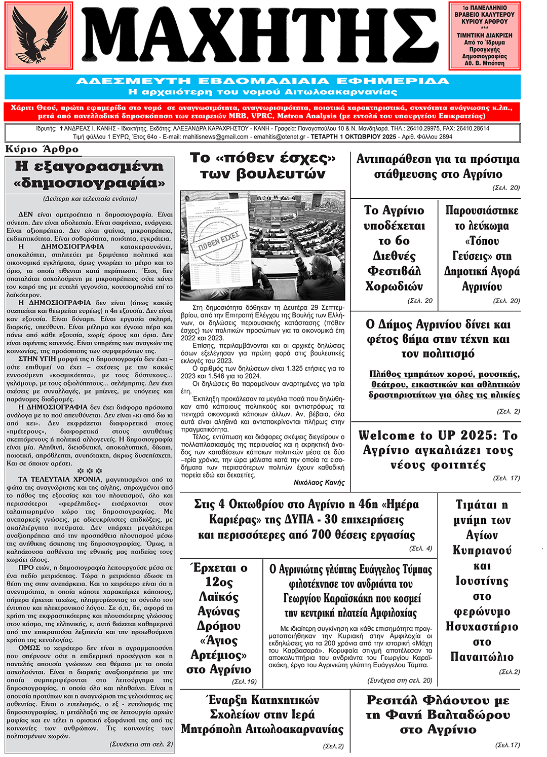 Το πρωτοσέλιδο του ΜΑΧΗΤΗ της Τετάρτης 1 Oκτωβρίου 2025