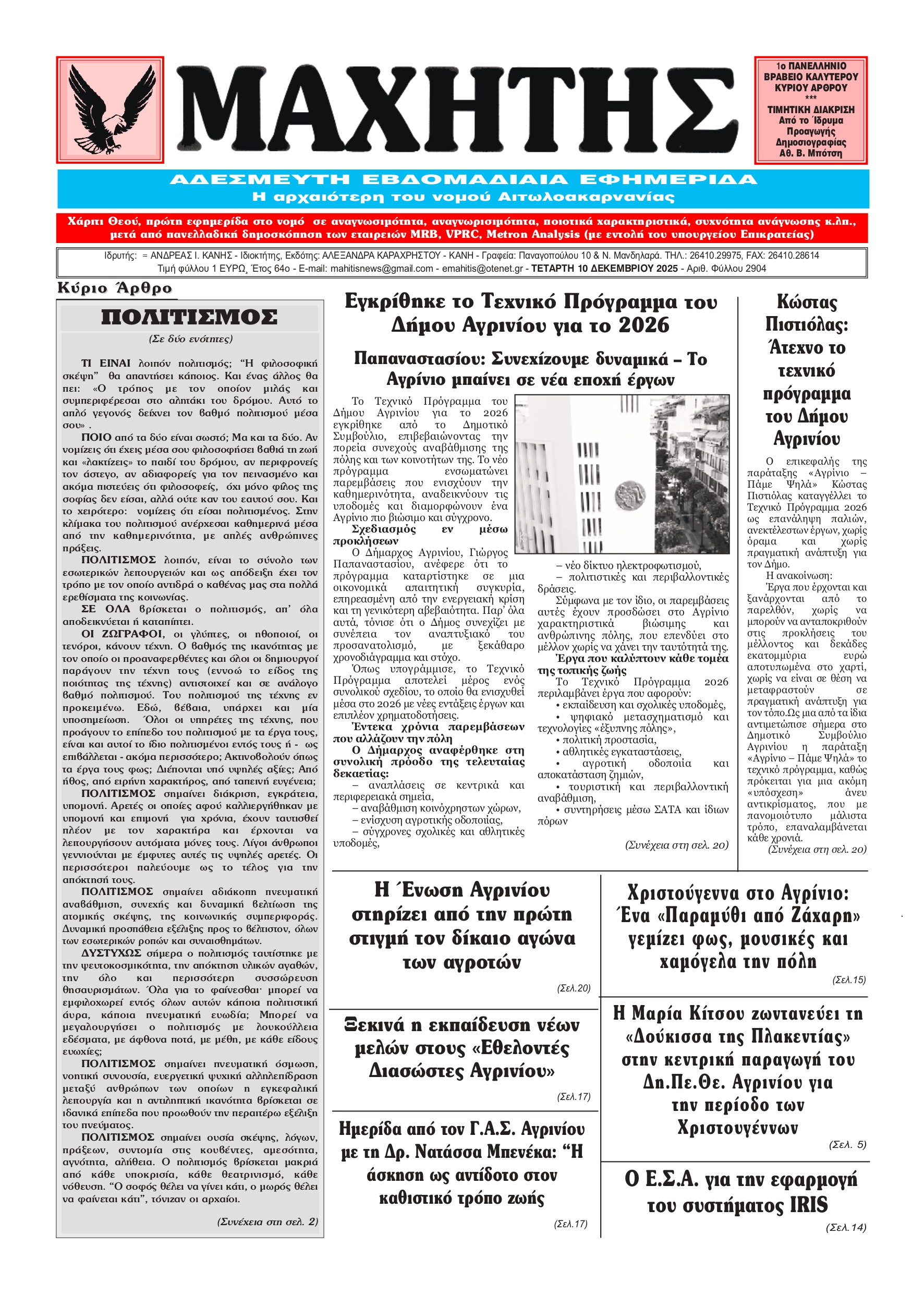 Το πρωτοσέλιδο του ΜΑΧΗΤΗ της Τετάρτης 10 Δεκεμβρίου 2025