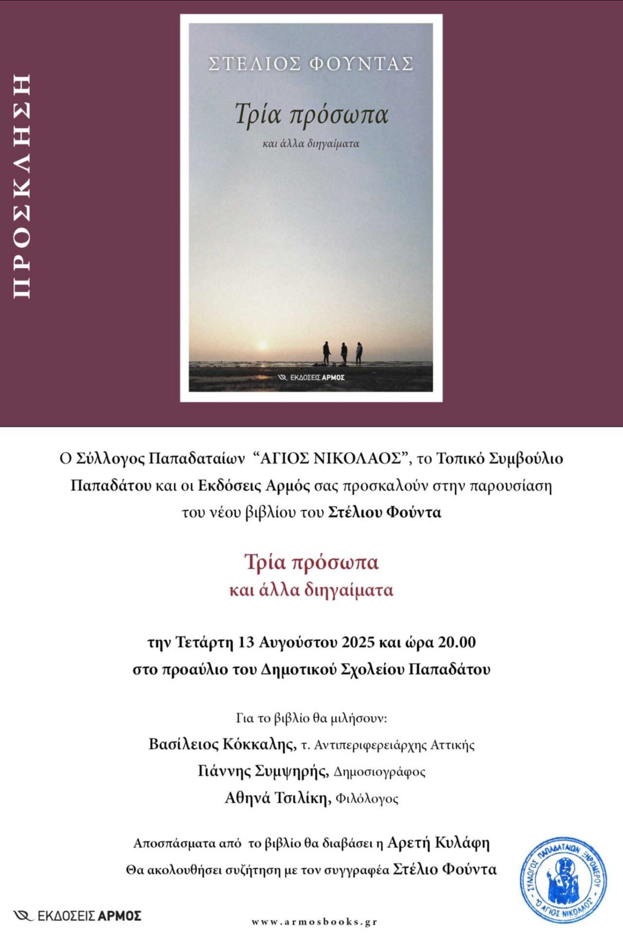 Ο Σύλλογος Παπαδαταίων «ΑΓΙΟΣ ΝΙΚΟΛΑΟΣ», το Τοπικό Συμβούλιο Παπαδάτου Ξηρομέρου και οι Εκδόσεις Αρμός σας προσκαλούν στην παρουσίαση του βιβλίου του Στέλιου Φούντα” Τρία πρόσωπα και άλλα διηγαίματα” την Τετάρτη 13 Αυγούστου 2025 και ώρα 20.00 στο προαύλιο του Δημοτικού Σχολείου Παπαδάτου Ξηρομέρου